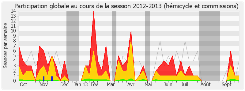 Présences enregistrées     Participations     Mots prononcés (x 10 000)     Vacances parlementaires   Présence médiane