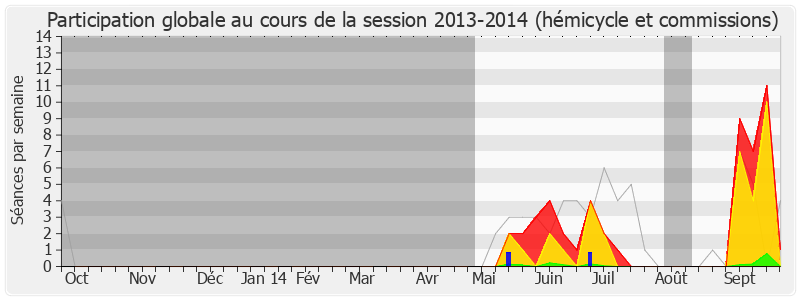Présences enregistrées     Participations     Mots prononcés (x 10 000)     Vacances parlementaires   Présence médiane