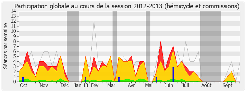 Présences enregistrées     Participations     Mots prononcés (x 10 000)     Vacances parlementaires   Présence médiane
