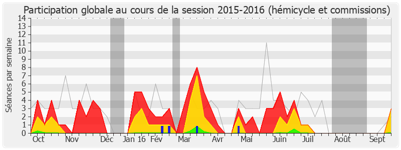 Présences enregistrées     Participations     Mots prononcés (x 10 000)     Vacances parlementaires   Présence médiane