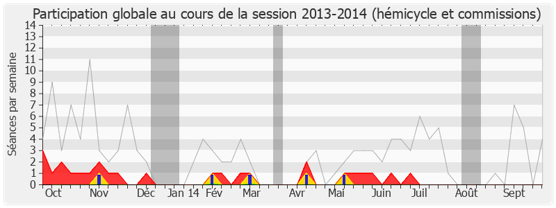 Présences enregistrées     Participations     Mots prononcés (x 10 000)     Vacances parlementaires   Présence médiane
